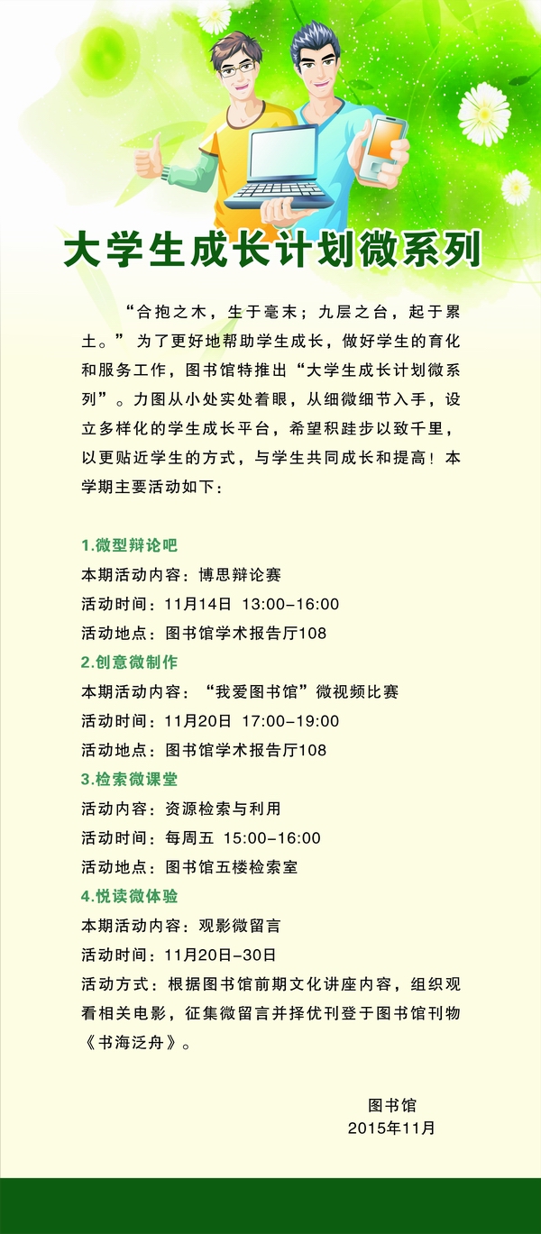 当前位置: 首页» 思政讲堂» 图书馆开展“大学生成长计划微系列”活动 思政讲堂 图书馆开展“大学生成长计划微系列”活动 来源:bat365官方网站 时间:2015-11-30 供稿部门: 点击量: bat365官方网站 分享: